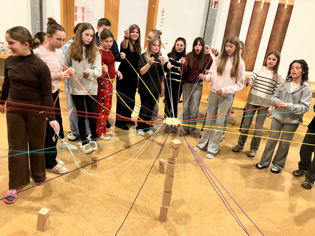 In der letzten Februarwoche 2026 verbrachte die Klasse 7c von Montag bis Mittwoch erlebnisreiche Orientierungstage in Teuschnitz im Jugendbildungshaus am Knock. Begleitet wurden die Schülerinnen und Schüler von den Lehrkräften Andreas Schüller, Jeannette Hofmann und Elke Buckreus. Die gemeinsame Zeit stand ganz im Zeichen der Stärkung der Klassengemeinschaft. Zu Beginn des Schuljahres waren aufgrund der vier verschiedenen Wahlpflichtfächergruppen neue Klassen gebildet worden. Die Orientierungstage boten daher eine wertvolle Gelegenheit, sich besser kennenzulernen, Vertrauen aufzubauen und das Miteinander bewusst zu gestalten. Diplompädagoge Andy Fischer sowie die Lehramtsstudentin Jule Ditsche hatten ein abwechslungsreiches Programm vorbereitet. Mit zahlreichen Eisbrechern und Spielen gelang es schnell, eine offene und entspannte Atmosphäre zu schaffen. Dabei wurden nicht nur Gemeinsamkeiten entdeckt, sondern auch individuelle Stärken sichtbar gemacht. Die Aktivitäten forderten die Teilnehmenden teilweise bis an die Grenzen ihrer Leistungsbereitschaft und zeigten eindrucksvoll, wie wichtig gegenseitige Unterstützung und Teamarbeit sind. Zu Beginn stellten sich die Schülerinnen und Schüler gegenseitig mithilfe von Steckbriefen vor. Positive Erwartungen an die gemeinsamen Tage wurden kreativ in Blumen festgehalten, während Befürchtungen ihren Platz in Wolken fanden. Am Mittwoch erfolgte eine gemeinsame Reflexion, bei der überprüft wurde, welche Hoffnungen sich erfüllt hatten und welche möglicherweise nicht. Ein besonderes Highlight war die Kooperationsaufgabe „Tower of Power“. Hier waren Geschicklichkeit, Feinmotorik und abgestimmte Teamarbeit gefragt. Durch gleichmäßiges Ziehen und Lockern von Schnüren musste ein Greifring gesteuert werden, um Bausteine präzise aufeinanderzustapeln. Das anfängliche Chaos wich nach und nach klaren Kommandostrukturen, guter Abstimmung und aufmerksamem Zuhören – ein eindrucksvolles Beispiel für gelungene Zusammenarbeit. Eine weitere aufschlussreiche Einheit beschäftigte sich mit der Rollenverteilung innerhalb der Klasse und der Schule. Mithilfe von Playmobilfiguren wurden soziale Strukturen nachgebildet, Hierarchien verdeutlicht und Beziehungen reflektiert. Dabei lernten die Schülerinnen und Schüler, Dynamiken bewusster wahrzunehmen und das eigene Verhalten kritisch zu hinterfragen. Auch der Umgangston bei Konflikten wurde thematisiert. Die Klasse analysierte, ob eher Ich-Botschaften verwendet oder Du-Konflikte formuliert wurden. In Gruppen erarbeitete Lösungsansätze wurden anschließend im Plenum vorgestellt und diskutiert. Beim Escape-Room waren schließlich logisches Denken, Kreativität und Teamgeist gefragt. Versteckte Hinweise mussten entschlüsselt und im wahrsten Sinne des Wortes „harte Nüsse“ geknackt werden – eine Herausforderung, die von allen mit großer Motivation angenommen wurde. Mit dem an PCs und Tablets genutztem Simulationsprogramm „Luk & Coco“ wurden emotionale Kompetenzen gefördert. Neben dem pädagogischen Programm kam auch die Freizeitgestaltung nicht zu kurz. Ob Billard, Kicker, Schach, Tischtennis oder Fußball – das Jugendbildungshaus bot zahlreiche Möglichkeiten für Bewegung und gemeinsames Erleben. Die Orientierungstage waren für die Klasse 7c eine wertvolle Erfahrung. Sie stärkten das Gemeinschaftsgefühl, förderten soziale Kompetenzen und legten eine wichtige Basis für ein positives Miteinander im Schulalltag. (BuE)