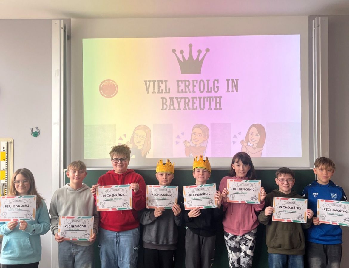 In einem spannenden Kopf-an-Kopf-Rennen rechneten sich Radostin Aleksandrov (5D) und Oliver Jacob (5B) an die Spitze und sicherten sich den Titel der schnellsten Kopfrechner unserer Schule. Begeistert gefeiert von ihren Klassen, wurden sie als neue Rechenkönige der RSII umjubelt. Ein herzliches Dankeschön auch an Noah Seuling (6A) und Erencan Hümmer (6C) für die tolle Begrüßung sowie an Alicia Fischer (5A), Max Fößel, Marius Dauer (5B), Hannes Barnickel (5C), Benedikt Mannser (5C) und Amy Reuther (5D), die bis zum Schluss eine starke Konkurrenz waren. (Tas)
