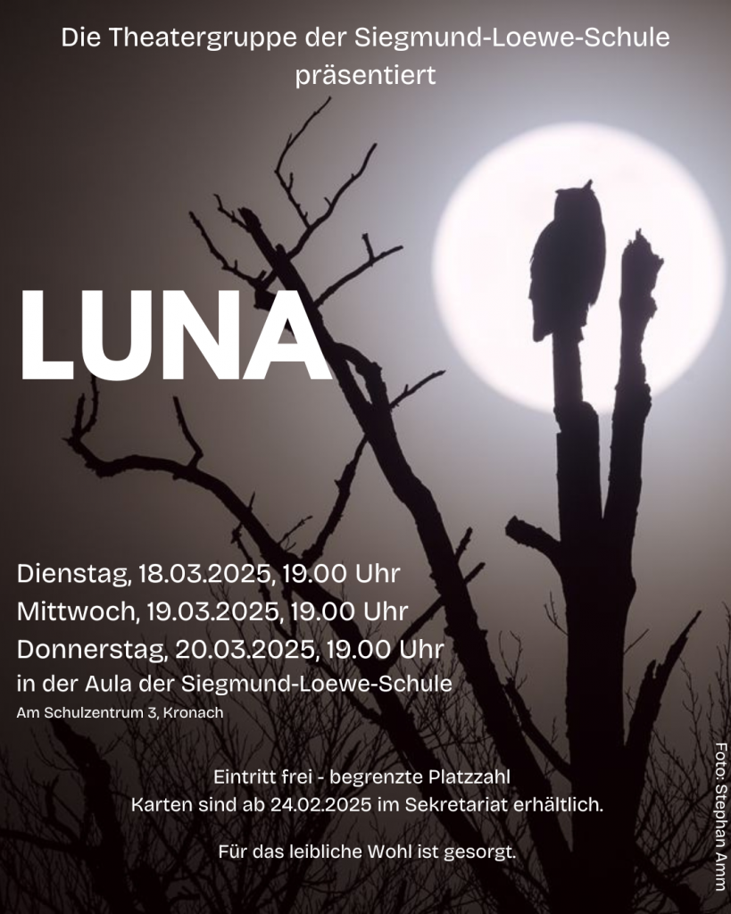 Die Theatergruppe der Siegmund-Loewe-Schule fiebert ihrem ersten großen Auftritt in diesem Schuljahr entgegen. Am kommenden Dienstag, den 18.3.2025, und am Mittwoch, den 19.3.2025, sowie am Donnerstag, den 20.3.2025, öffnet sich um 19:00 Uhr in der Aula unserer Realschule der Vorhang für „Luna“.